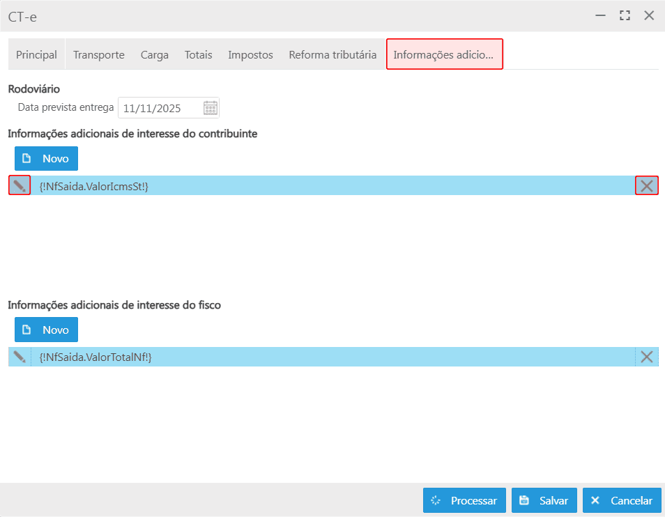 Após o preenchimento de todas as abas, são disponibilizados os botões Salvar, Processar e Cancelar na parte inferior da tela.