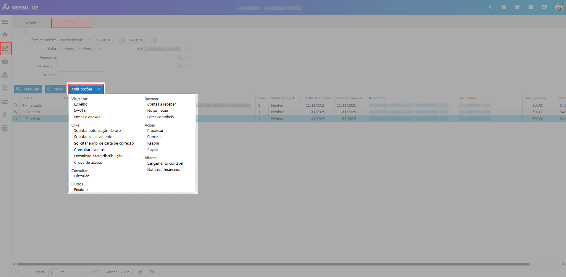 Contas a receber: direciona para os títulos financeiros originados do CT-e;
