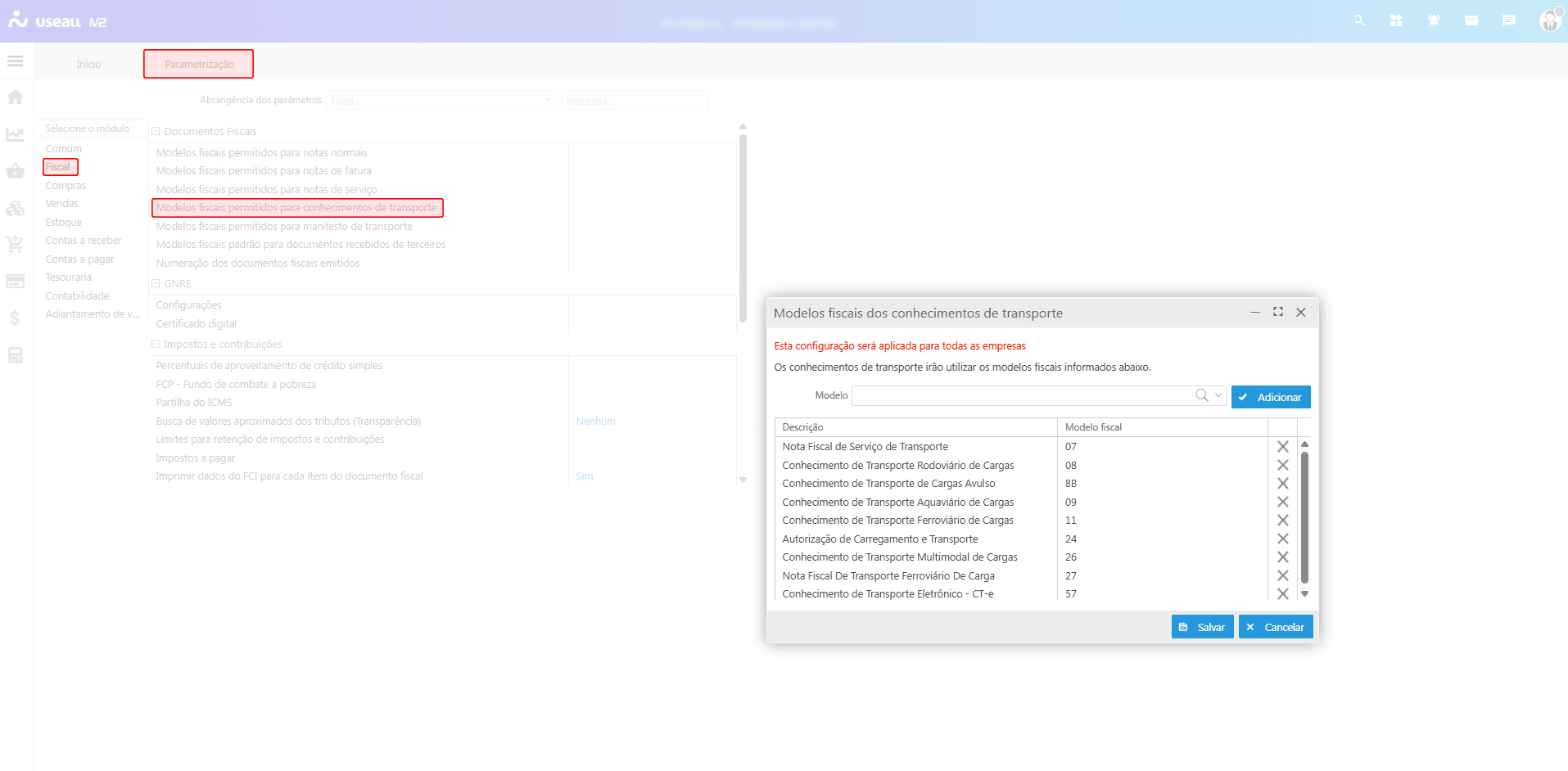 Essa parametrização define quais modelos fiscais estarão disponíveis para emissão do CT-e. Acesso disponível em Início > Parametrizações > Fiscal > Modelos fiscais permitidos para conhecimentos de transporte.