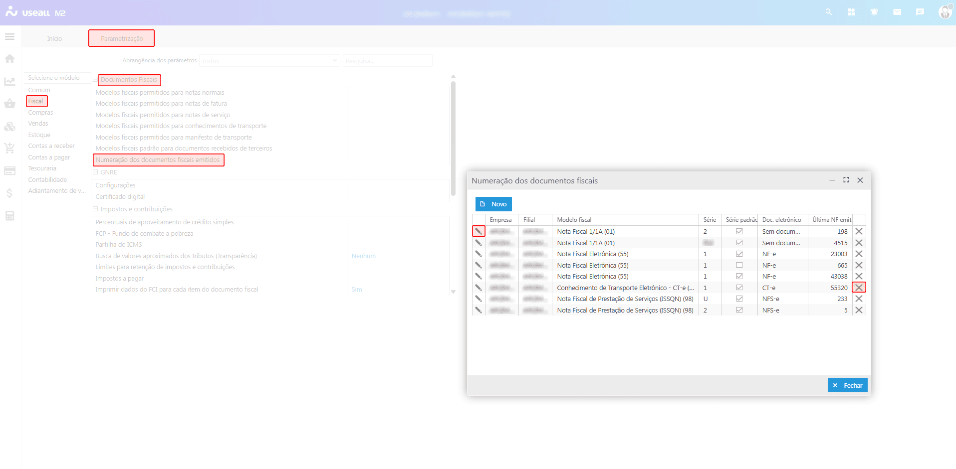 Essa parametrização define a série e o controle numérico que será utilizado para emissão do CT-e. Acesso disponível em Início > Parametrizações > Fiscal > Numeração dos documentos fiscais.