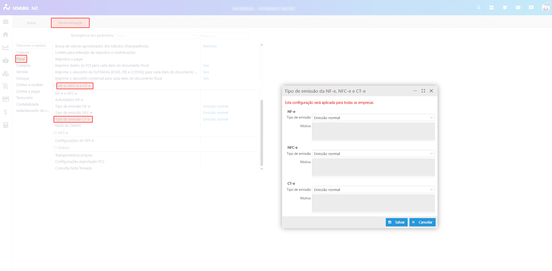 Essa parametrização determina o tipo de emissão que será utilizado Normal ou Contingência e, quando necessário, o motivo associado. Acesso disponível em Início > Parametrizações > Fiscal > Tipo de emissão CT-e.