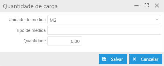Botão Novo: permite adicionar uma quantidade transportada. Ao acionar este botão, a tela Quantidade de carga será exibida, contendo os campos: