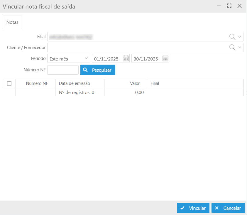 Botão Vincular notas do sistema: permite localizar e vincular uma nota fiscal de saída já registrada no sistema. Ao acionar o botão, a tela Vincular nota fiscal de saída será exibida para busca e seleção da nota.