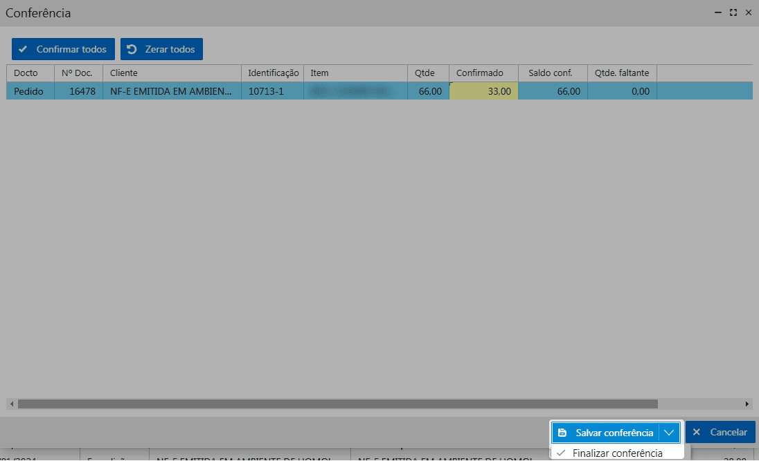 Quando informada uma quantidade menor que o valor da coluna Saldo conf., o botão Salvar conferência ficará na cor azul e terá a opção Finalizar conferência, se clicar no botão a conferência será salva podendo ser finalizada conforme necessário. Se clicar na opção Finalizar conferência a mesma será finalizada, não podendo alterar as informações conferidas;