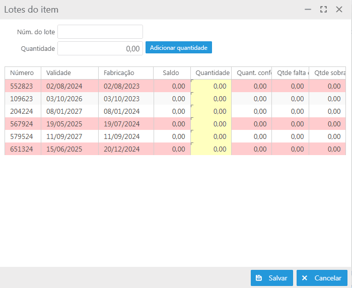 Manual: ao clicar no link Lotes, pode-se informar a quantidade a ser conferida em cada lote conforme sua necessidade. A linha dos lotes vencidos, serão destacadas em vermelho.