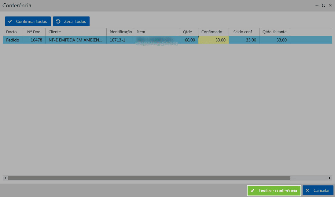 Ao selecionar um ou mais registros e clicar no botão Conferir será exibida a tela de Conferência dos itens. Nesta tela é possível confirmar ou zerar todos os itens apresentados.
