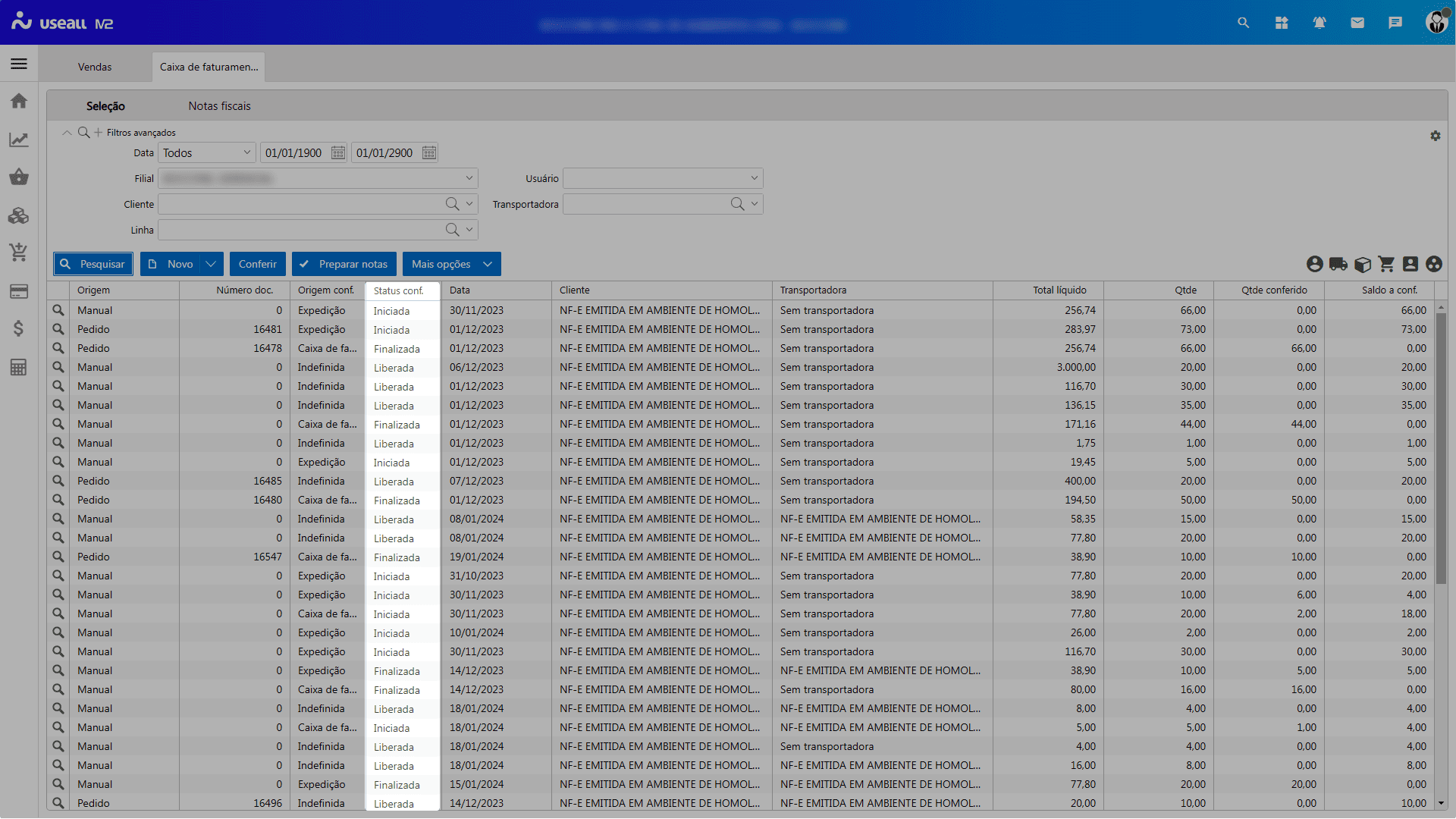 Na listagem da Caixa de faturamento também será exibido o Status da conferência, sendo eles: