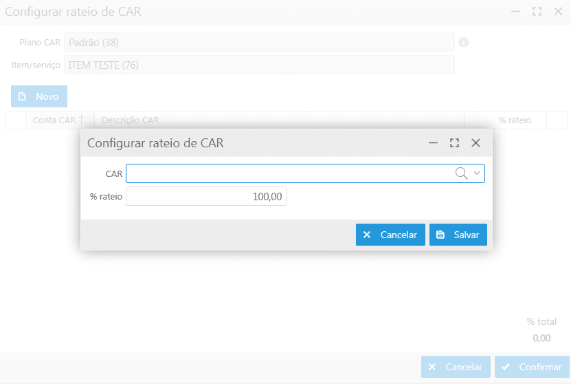 Configurar rateio de CAR: permite configurar percentuais de rateios de CDC que serão utilizados nos lançamentos contábeis, caso a regra contábil utilizada possua "Origem CAR" configurada com a opção "Rateio por CAR". Ao selecionar essa opção, a tela Configurar rateio de CAR será exibida, basta clicar no botão Novo e informar o CAR juntamente com o % de rateio, após deve-se clicar no botão Salvar retornando para a tela e clicar no botão Confirmar para finalizar a configuração;