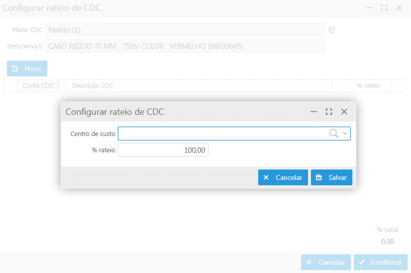 Configurar rateio de CDC: permite configurar percentuais de rateios de CDC que serão utilizados nos lançamentos contábeis, caso a regra contábil utilizada possua "Origem CDC" configurada com a opção "Rateio por item". Ao selecionar essa opção, a tela Configurar rateio de CDC será exibida, basta clicar no botão Novo e informar o centro de custo juntamente com o % de rateio, após deve-se clicar no botão Salvar retornando para a tela e clicar no botão Confirmar para finalizar a configuração;