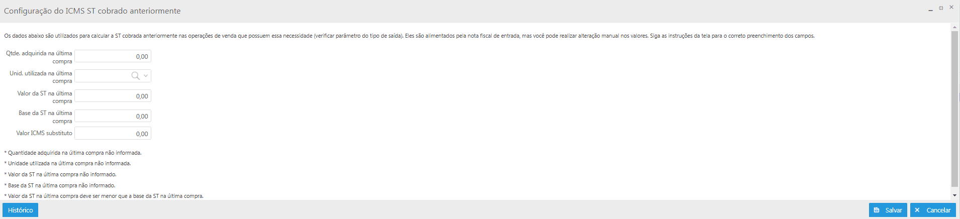 ICMS ST cobrado anteriormente: os dados desta tela Configuração do ICMS ST cobrado anteriormente são utilizados para calcular a ST cobrada anteriormente nas operações de venda que possuem essa necessidade, esses dados são alimentados pela NF-e, mas pode-se realizar alteração manual destes valores.