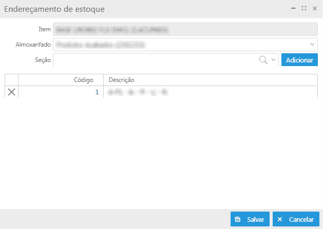 Manutenção de endereçamento de estoque: permite cadastrar e alterar o endereçamento de estoque do item (seção). Basta informar o almoxarifado e selecionar a seção disponível.