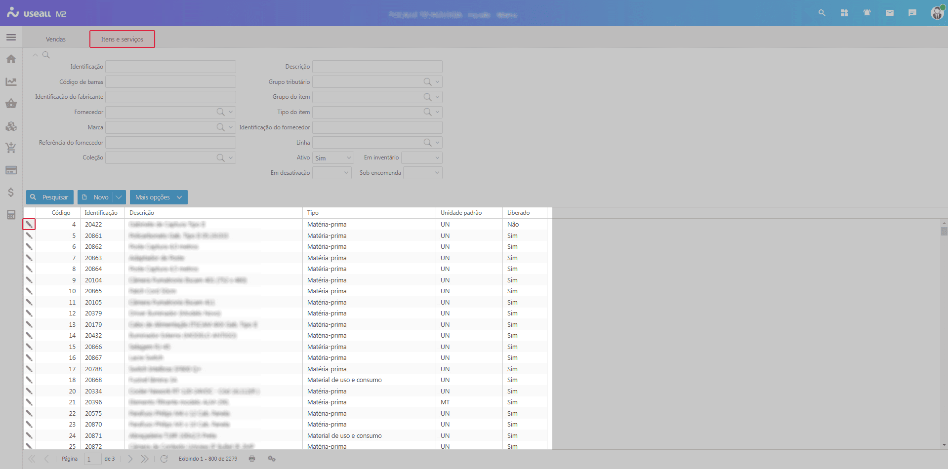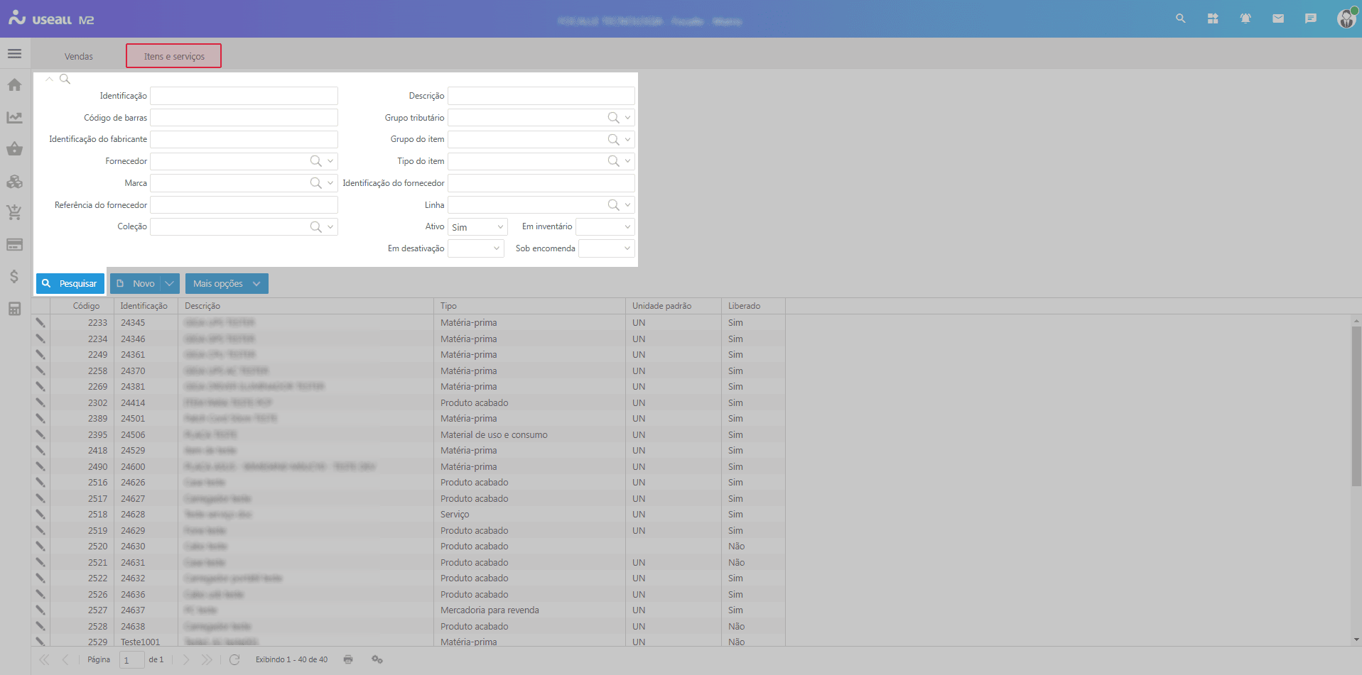 Ao acessar a funcionalidade de Itens e serviços, são exibidos os filtros e botão pesquisar, botão Novo, grid de informações e o botão Mais opções.