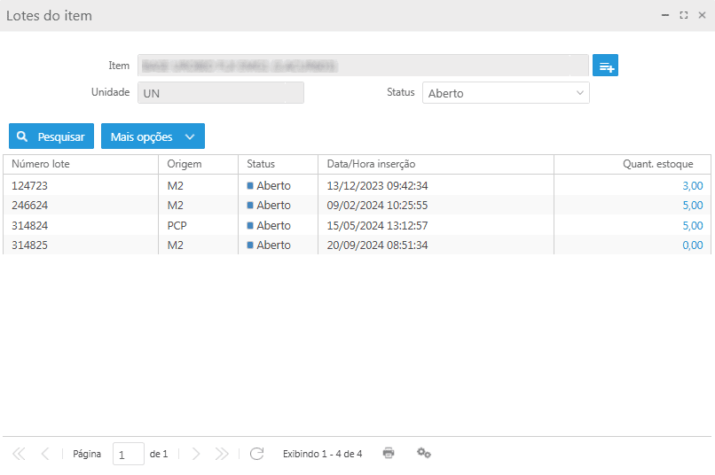 Manutenção de lotes: permite cadastrar novos lotes para o item, através do ícone