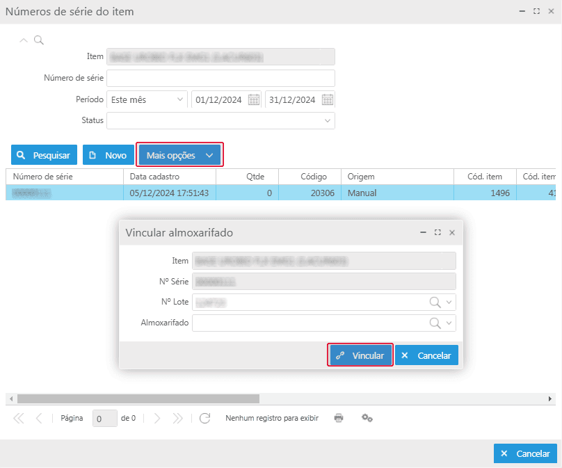 - Após, deve-se vincular o número de série a um almoxarifado, clicando no botão Mais opções > Vincular o número de série do almoxarifado ;