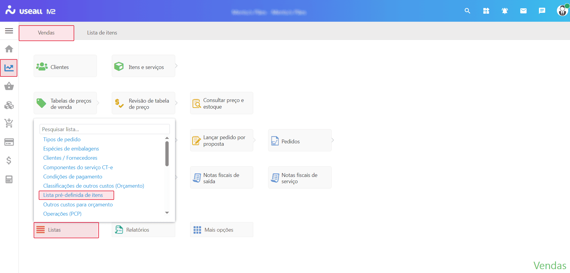 O acesso está disponível no Módulo Vendas > Listas > Lista pré-definida de itens