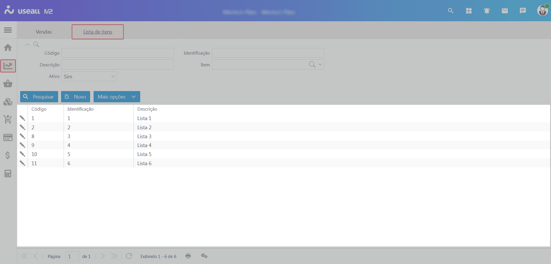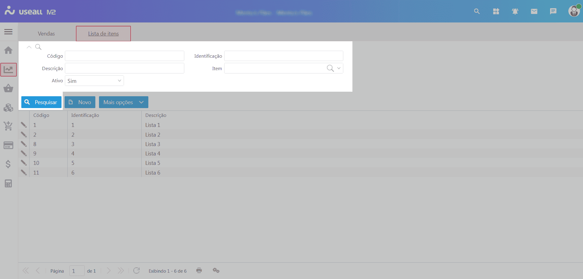 Ao acessar a funcionalidade de Lista pré-definida de itens, são exibidos os filtros e botão pesquisar, botão Novo, grid de informações e o botão mais opções.