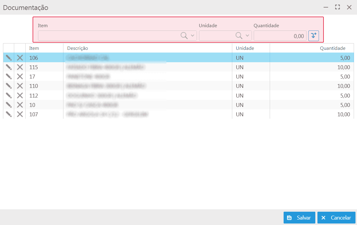 Após inserido os itens, basta clicar no botão Salvar, retornando para a grid de informações.