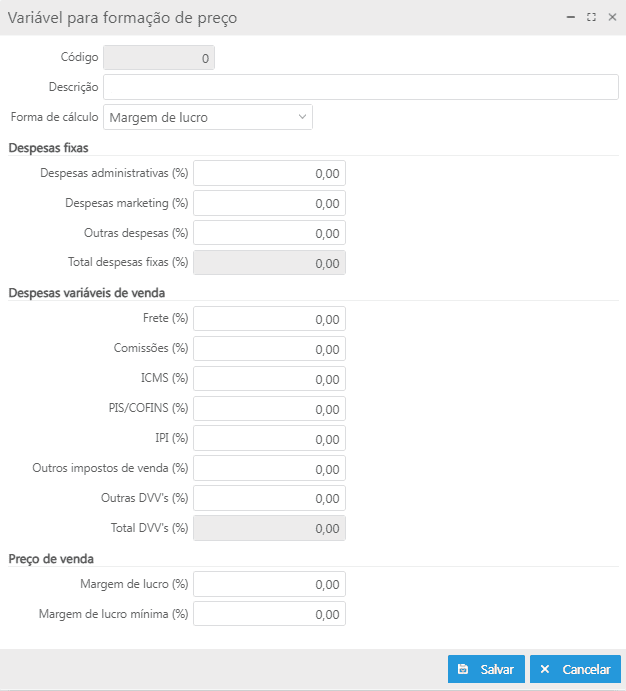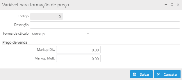 Descrição: deve-se informar uma descrição para identificação da variável de formação de preço;