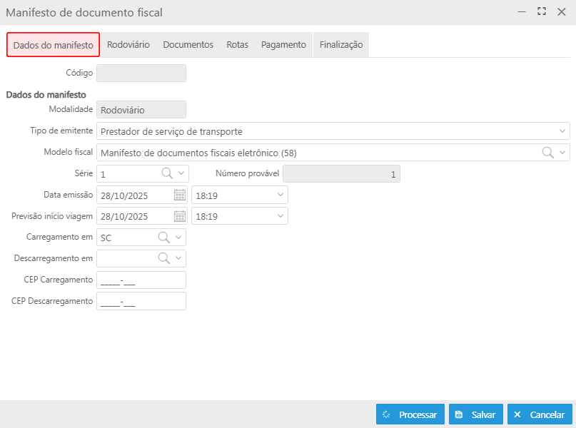 Ao acionar o botão Novo, a tela do Manifesto de Documentos Fiscais é exibida. Essa tela é organizada em abas, que reúnem as informações necessárias para o cadastro do manifesto.