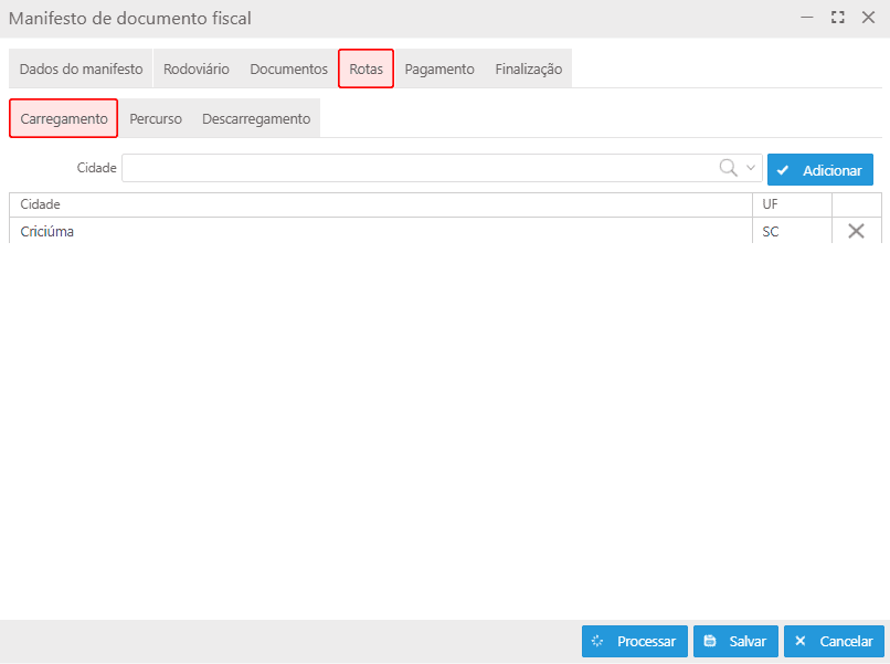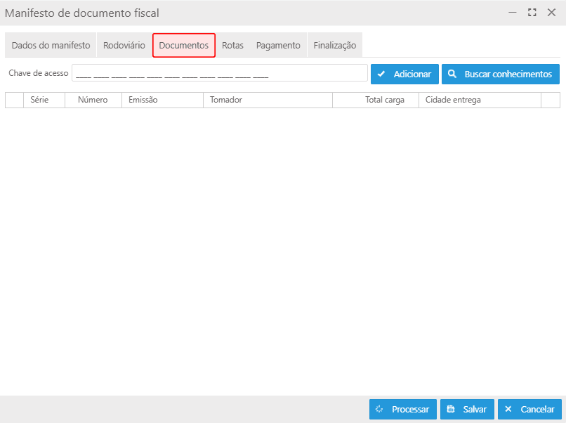 Processar: ao selecionar essa opção, o sistema processará o MDF-e, aplicando as validações e regras de negócio;