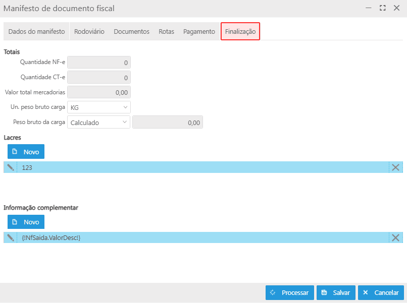 A aba Finalização apresenta o resumo das informações totais do manifesto, além de permitir o cadastro de lacres e informações complementares vinculadas ao MDF-e.