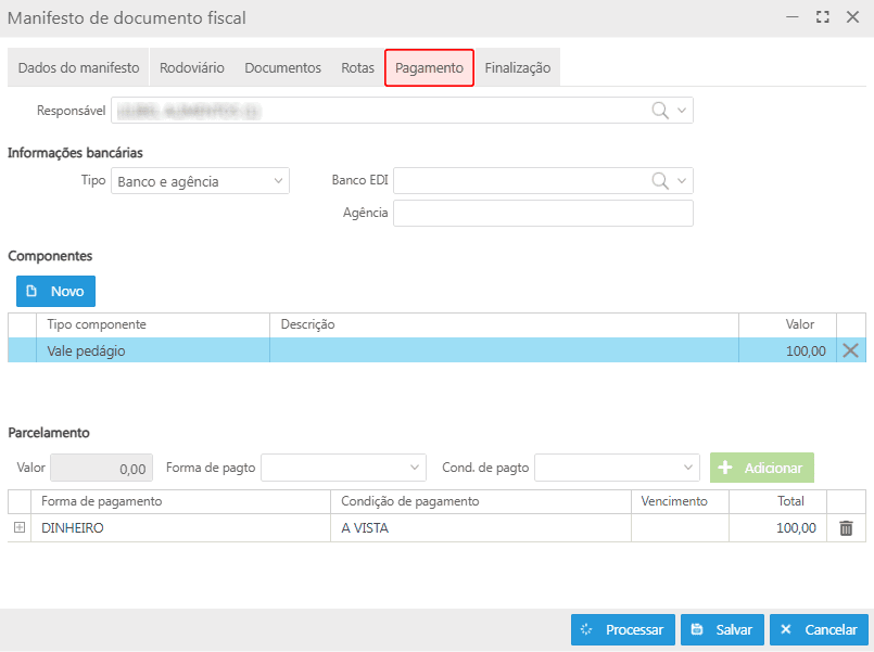 As seções Informações bancárias, Componentes e Parcelamento somente são habilitadas para preenchimento quando o responsável pelo pagamento for informado.