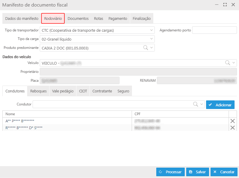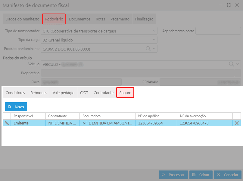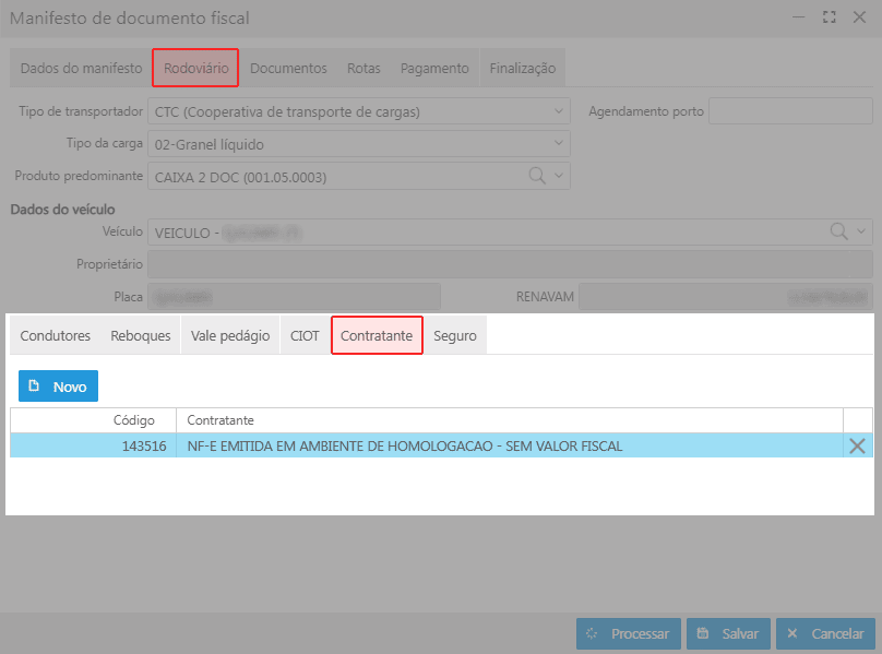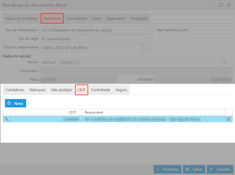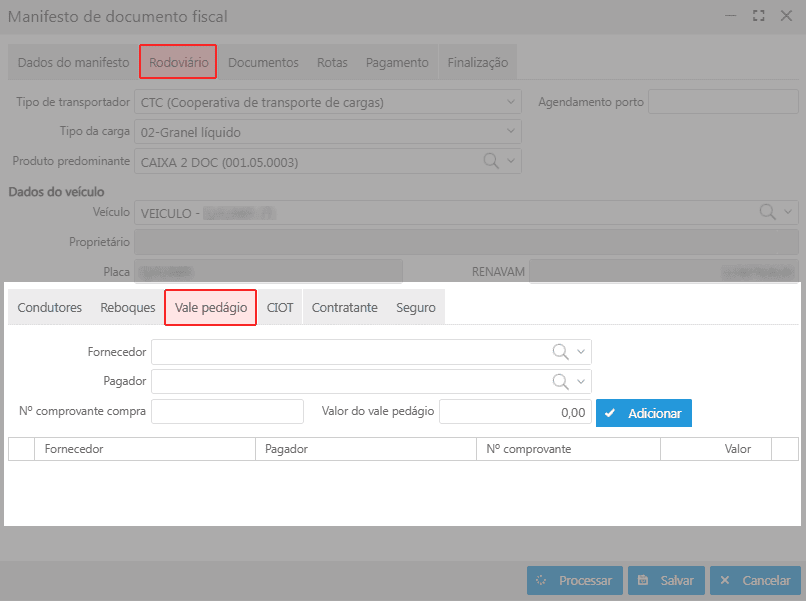 O campo Veículo deve ser preenchido com um registro ativo e compatível com o tipo de transportador informado. Caso o veículo esteja vinculado a um proprietário não cadastrado, o manifesto não poderá ser processado.