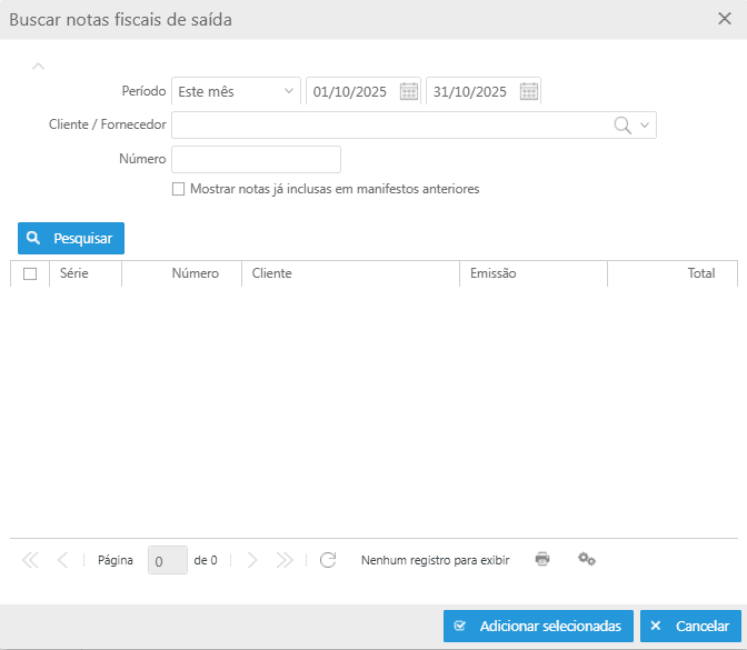 , ao clicar nesta ação ou dar dois cliques sobre o item é aberto a tela do Manifesto de documento fiscal.