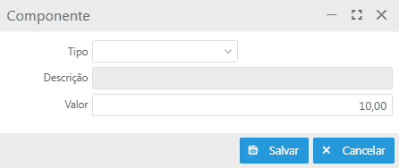 Botão Novo: ao clicar no botão a tela Componente será exibida, permitindo o preenchimentos dos dados de novo componente financeiro relacionado ao pagamento do frete.
