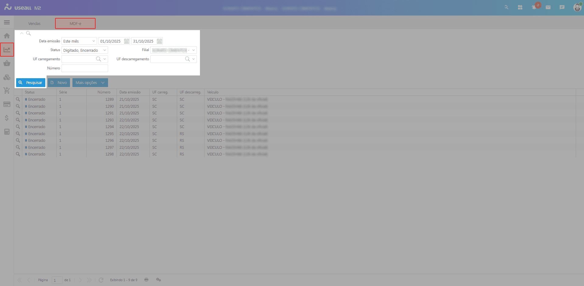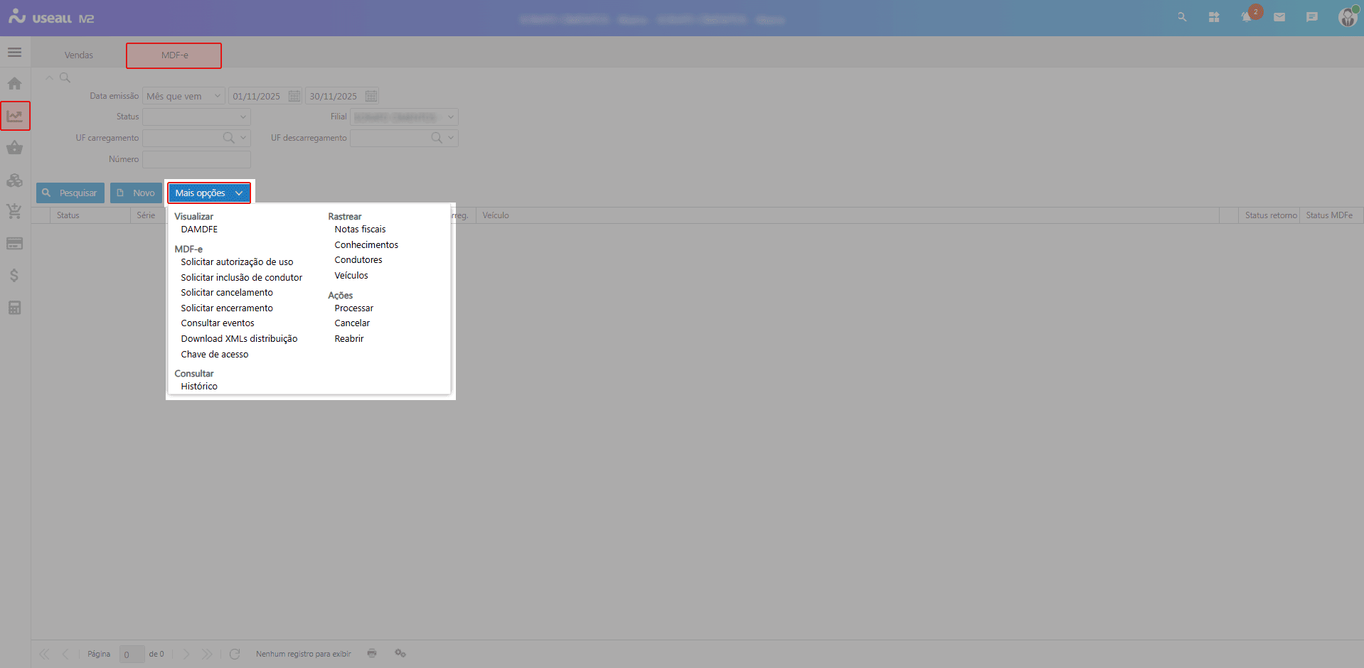 Ao acessar a funcionalidade de MDF-e são exibidos os filtros e botão pesquisar, botão novo, grid de informações e o botão mais opções.