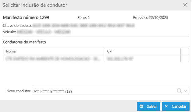 Solicitar inclusão de condutor: ao selecionar essa opção, será exibida a tela para incluir um novo condutor ao MDF-e já autorizado;