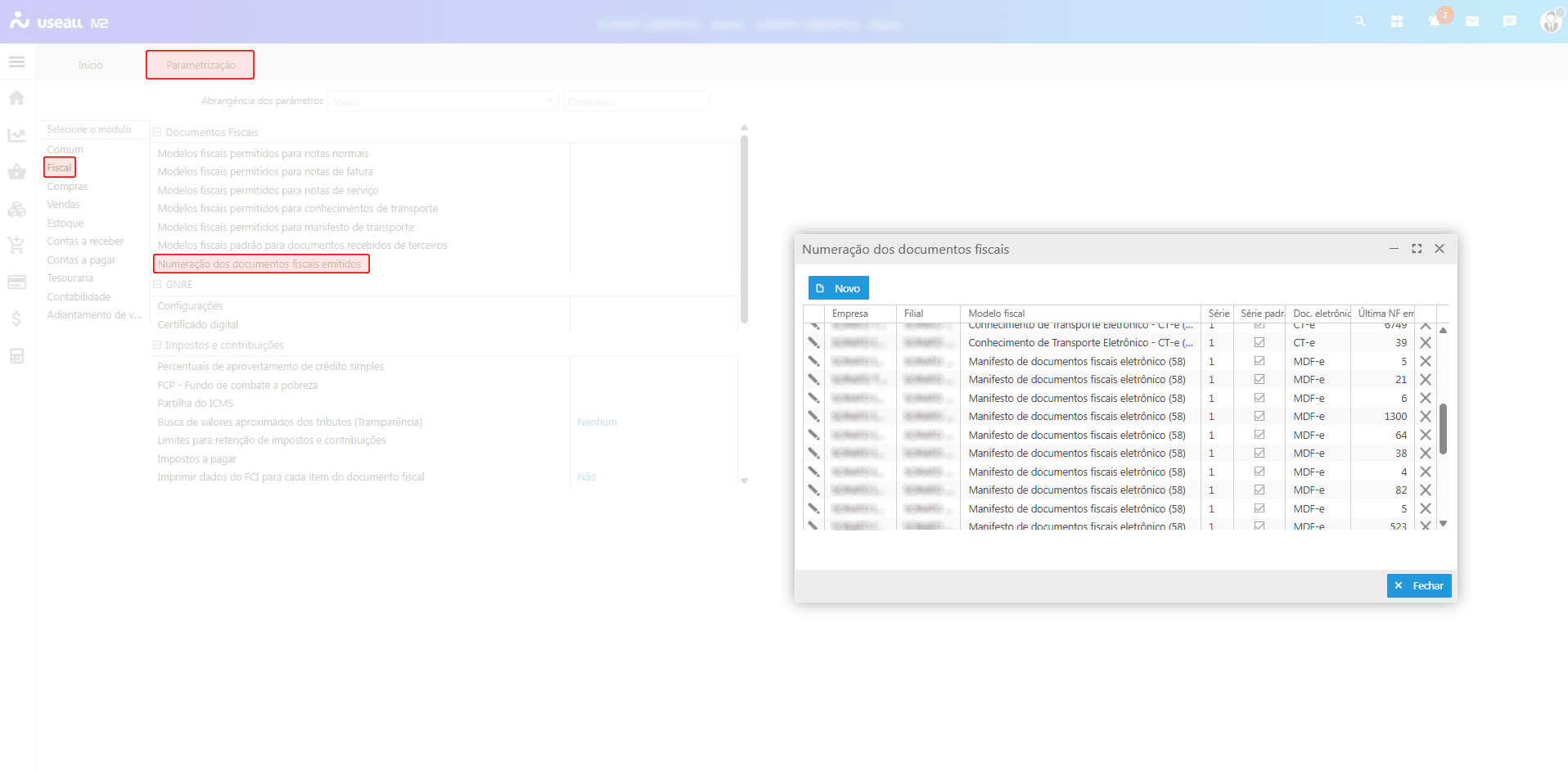 Para utilizar a ferramenta de MDF-e, é necessário realizar a parametrização disponível em Início > Parametrizações > Fiscal > Numeração dos documentos fiscais emitidos.