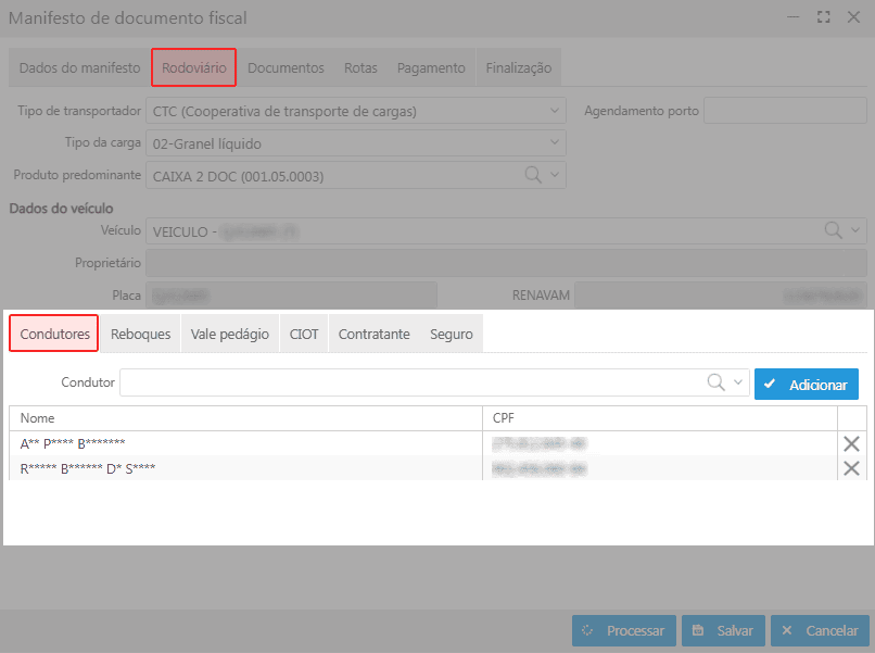 Após selecionar o condutor, é necessário clicar no botão Adicionar para que o registro seja exibido na grid.