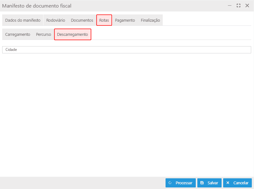 Grid: apresenta as cidades de descarregamento vinculadas ao manifesto.