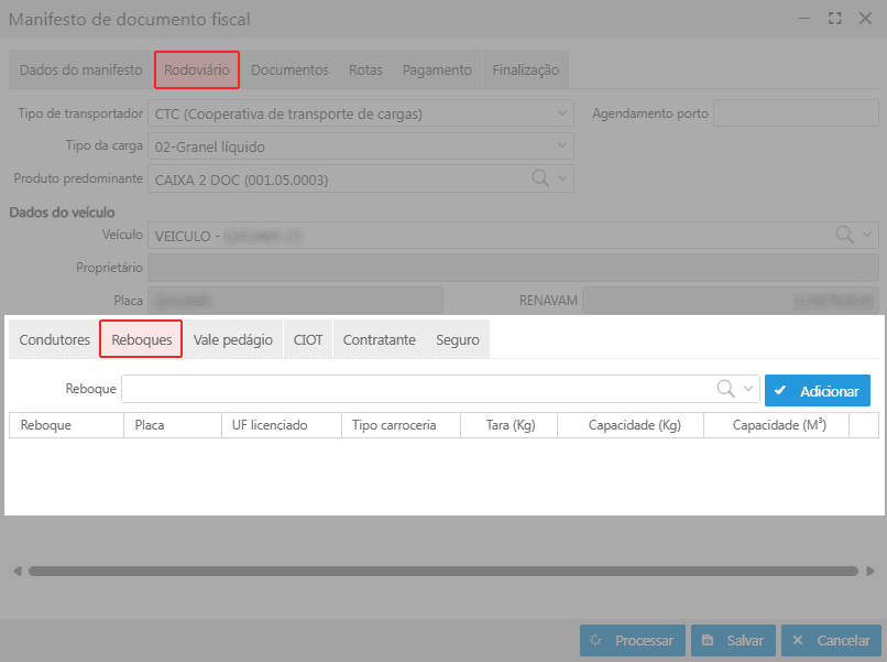 Nesta sub-aba são informados os reboques vinculados ao veículo tracionador utilizado no transporte.