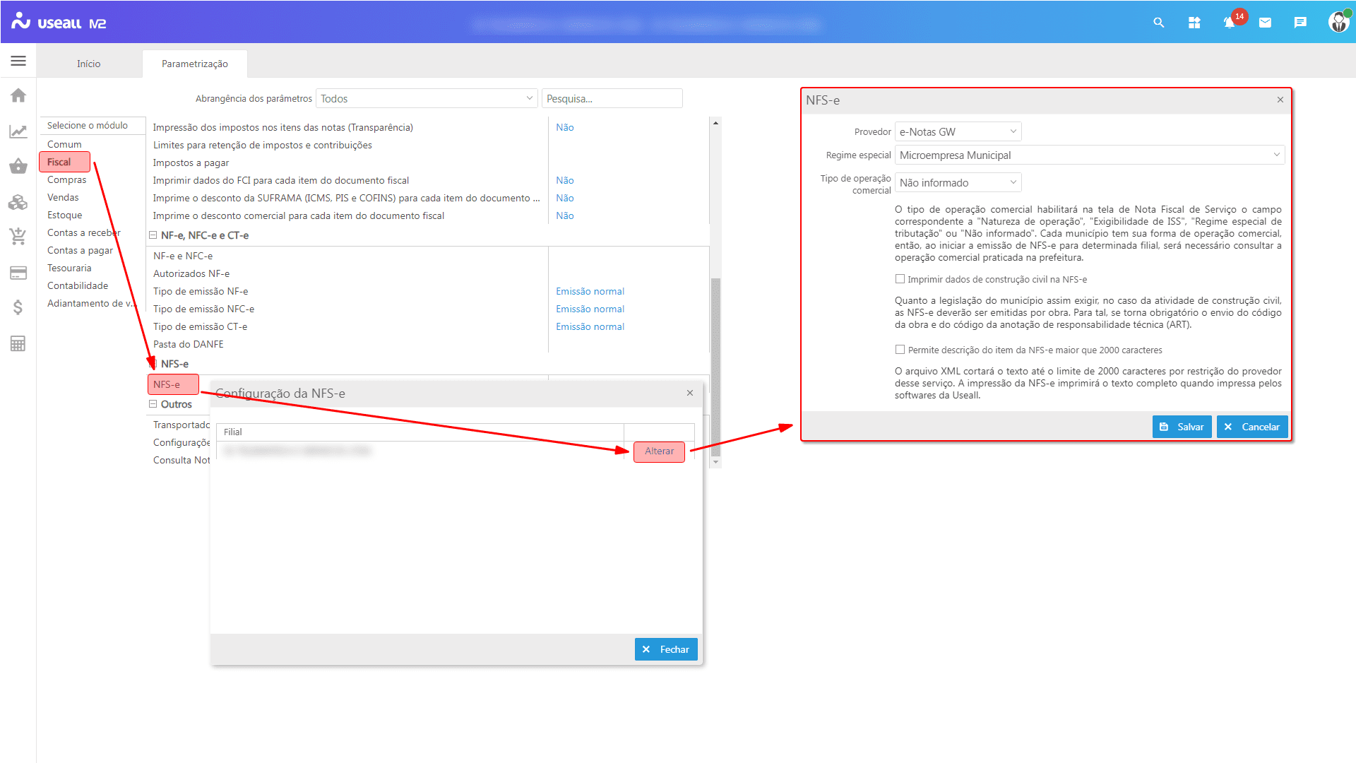 Acesso em: Início > Parametrização > Fiscal > NFS-e
