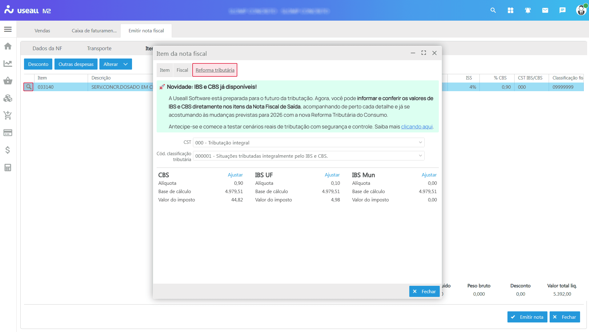 Na tela Itens da nota fiscal, disponível na aba Itens, tem-se a nova aba Reforma tributária contendo as informações dos novos tributos: