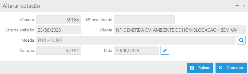 - Cotação: ao selecionar esta opção, exibe a tela para alterar a cotação da moeda utilizada no pedido;