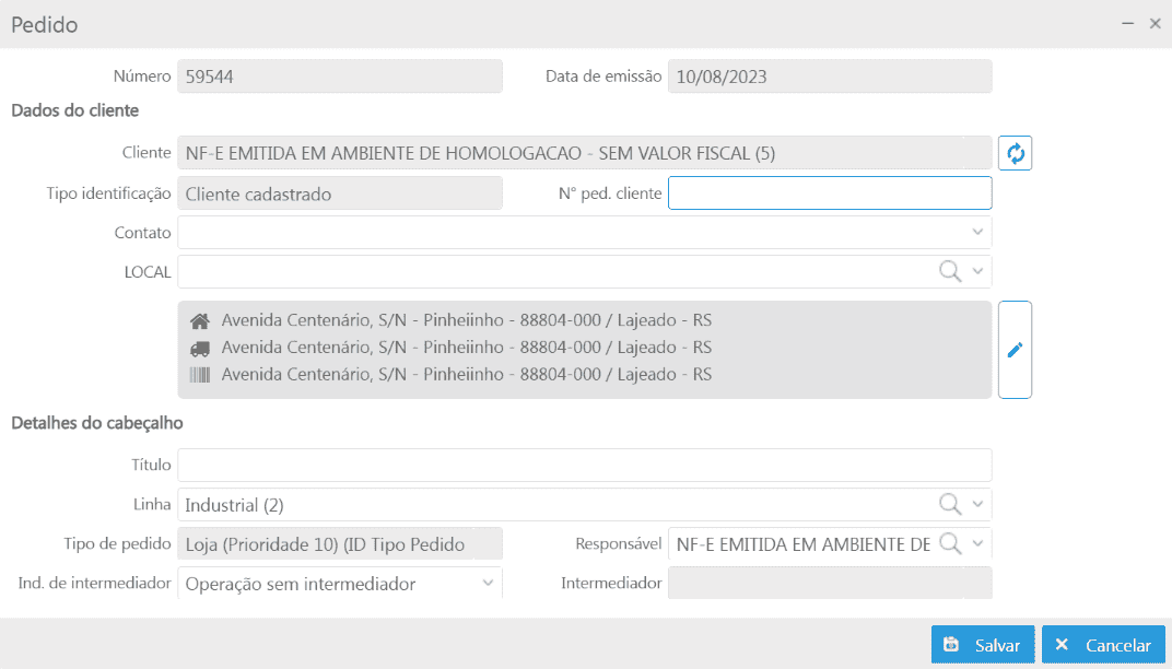 Ao clicar no botão Novo é apresentada a tela para criar um novo pedido, dividida em duas partes: Dados do cliente e Detalhes do cabeçalho.