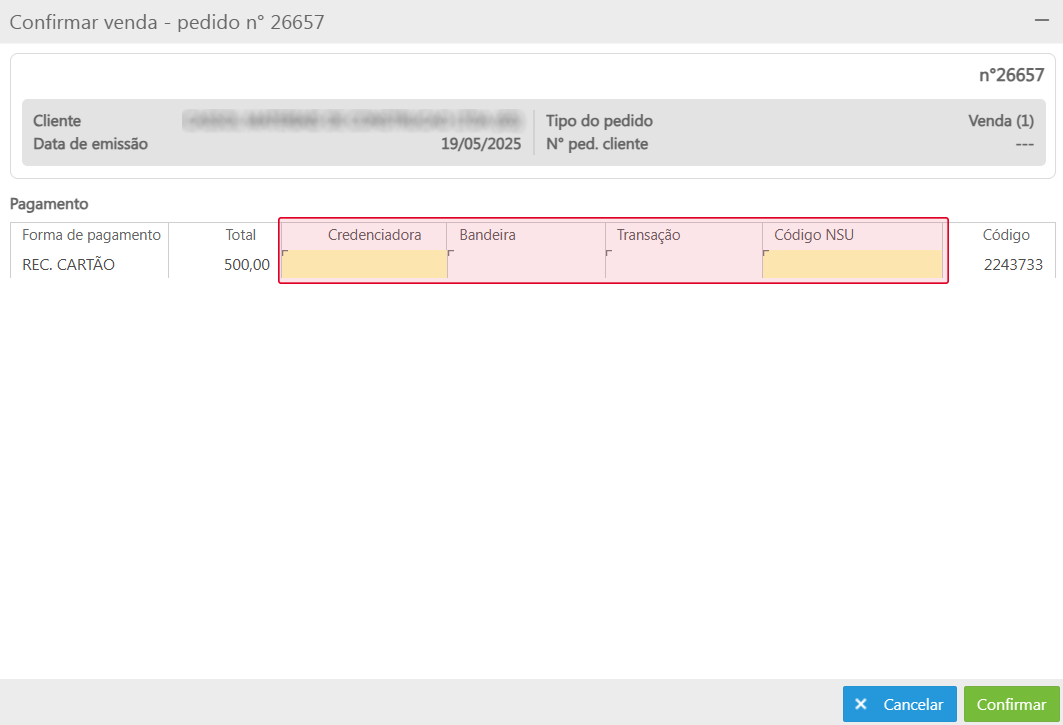- Confirmar venda: ao selecionar esta opção irá abrir a tela Confirmar venda, contendo os dados de pagamento do pedido, sendo necessário preencher as colunas "credenciadora, bandeira, transação e código NSU", conforme os dados do pagamento. Após deve-se clicar no botão Confirmar, o status de confirmação do pedido passa para Confirmado;