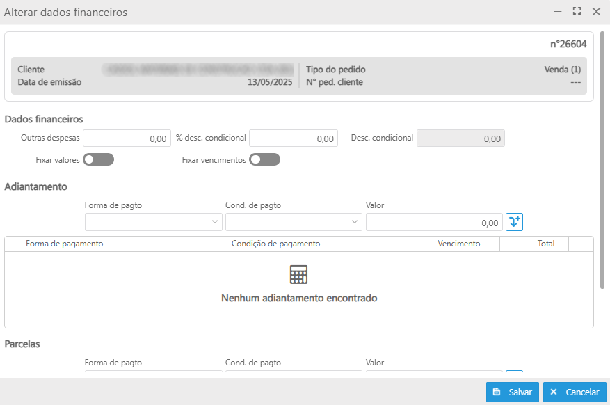 Dados financeiros: é possível realizar ajustes nos dados financeiros do pedido. O comportamento dessa ação em relação ao adiantamento, segue o mesmo da aba Financeiro;