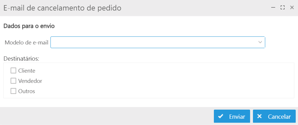 - Enviar cancelamento de pedido: abre a tela que permite selecionar o modelo de e-mail e para quais destinatários, será enviado o cancelamento do pedido. Somente pedidos com o status cancelado, pode executar essa ação;