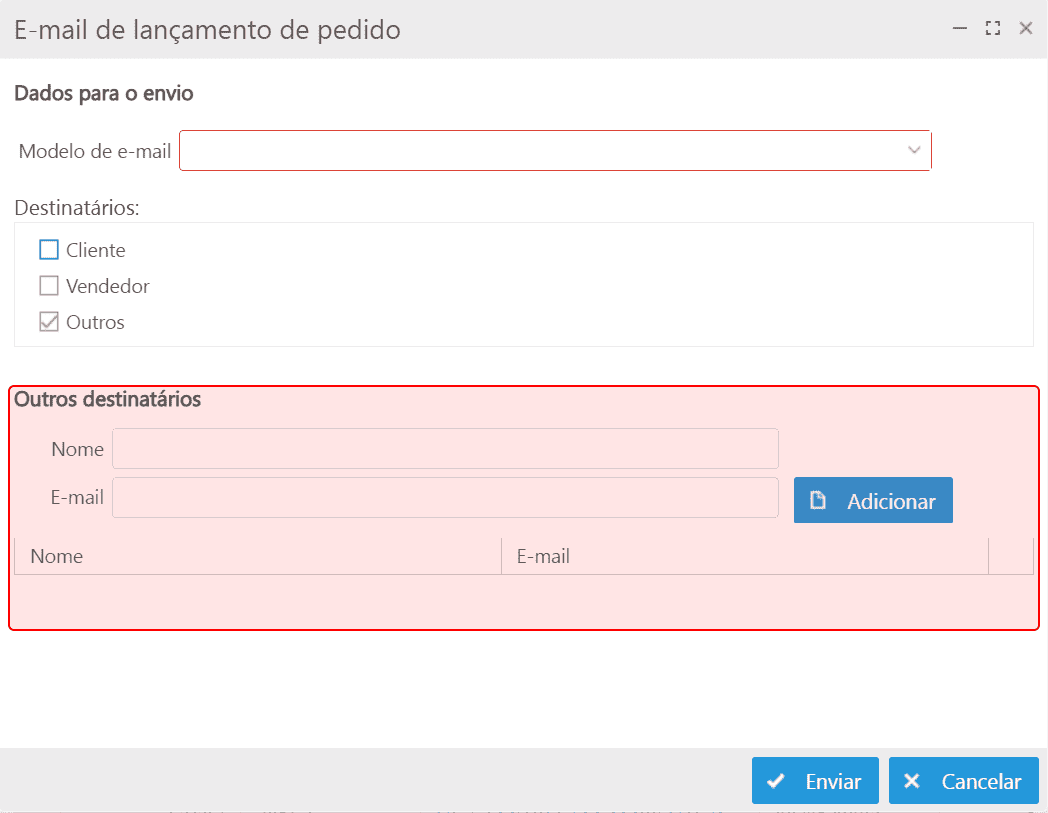 - Enviar lançamento de pedido: abre a tela que permite selecionar o modelo de e-mail e para quais destinatários, será enviado o pedido;