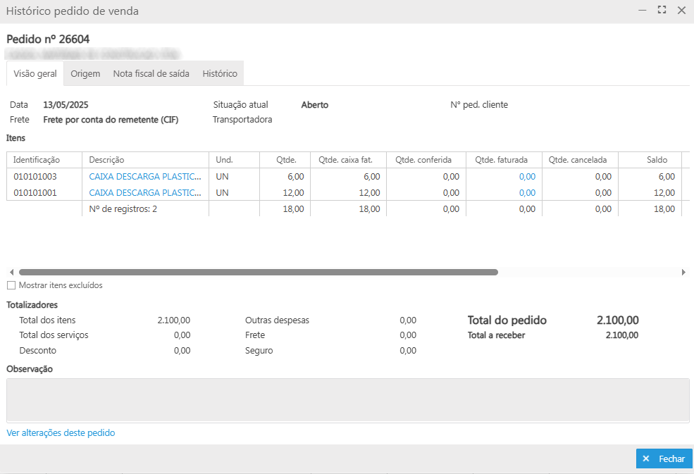 Previsão de entrega: permite alterar a data de previsão de entrega. Ao calcular o prazo de entrega, pode ocorrer alteração nos valores;