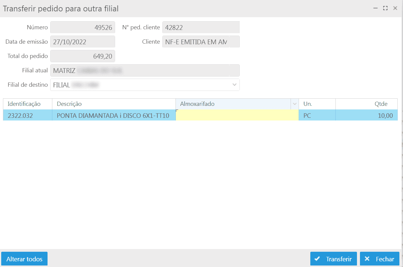 Pode-se alterar o almoxarifado dos itens no pedido com status parcial, porém se o item selecionado estiver com conferência iniciada na caixa de faturamento, não será possível executar esta alteração.