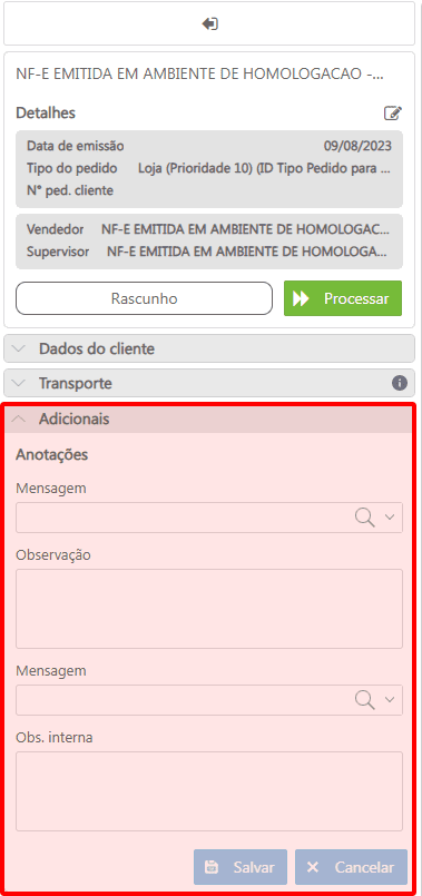 Notas e anexos: permite adicionar notas e anexos ao pedido;