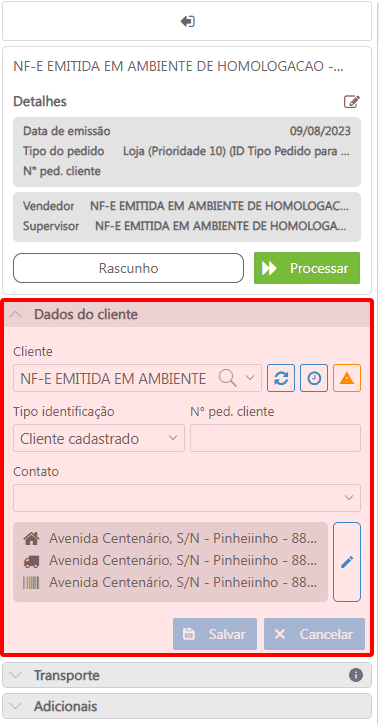 Em seguida é apresentado o quadro dados do cliente, com as mesmas informações que foram adicionadas na criação de pedido, com exceção do campo contato que permite selecionar um contato vinculado ao cliente informado. Também exibe os endereços do cliente juntamente com o botão possibilitando a edição.