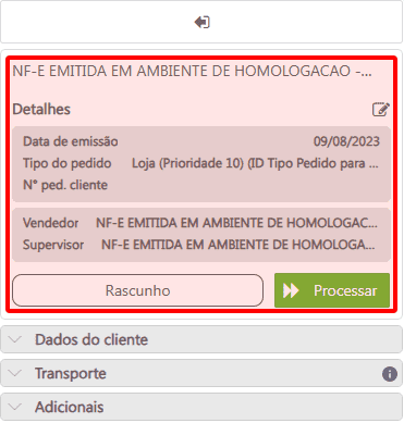 Ao visualizar um pedido, o painel esquerdo é apresentado conforme na criação de um pedido, porém o botão Processar não fica disponível e nem será possível editar as informações. Ao clicar no botão a aba lateral será recolhida.