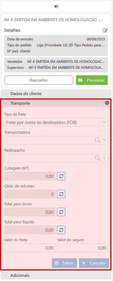 Ao atualizar a Cubagem (m³), Qtde. de volumes, Total peso bruto ou Total peso líquido, o sistema salvará automaticamente os dados.