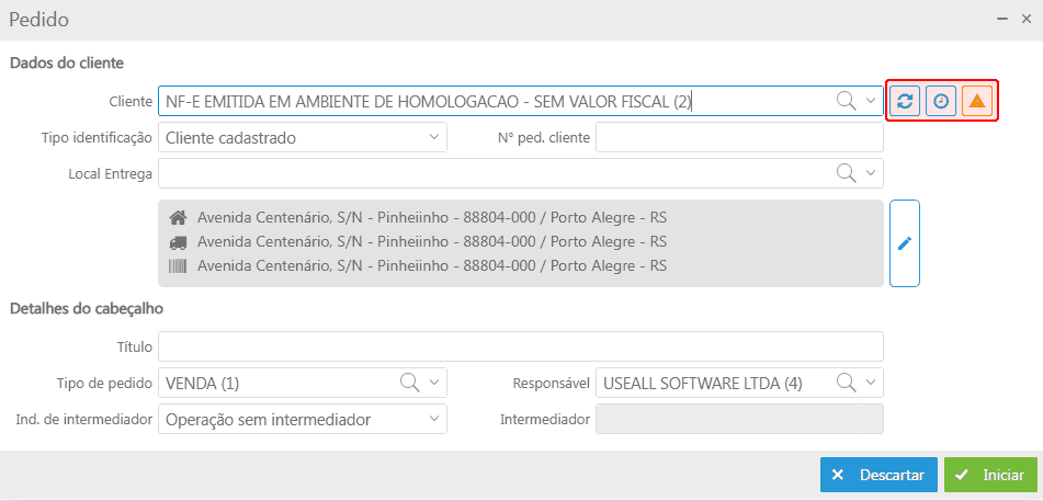 Após preencher estes dados, basta clicar no botão Iniciar para abrir a tela do pedido e preencher as demais informações.